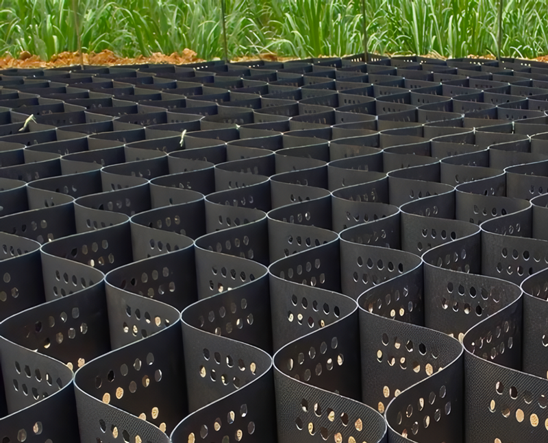 Sistema de paneles fabricados con material geosintético -polietileno de alta densidad (HDPE)- con forma de celdillas hexagonales. Estas celdas se llenan con suelo, agregados o materiales granulares y se compactan para formar una estructura rígida y resistente para la estabilización del suelo y la contención de materiales.